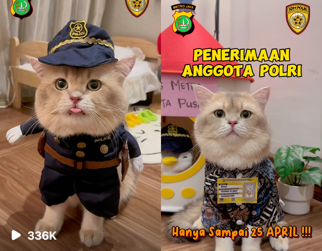 Next, there is Kiwi, a British Shorthaired cat who’s also an attention stealer. Last month, Kiwi (@kiwibritishcat) did the cross-species recruitment promotion by partnering with @birosdmpmj Human Resources Bureau of the Greater Jakarta Metropolitan Regional Police (Biro SDM Polda Metro Jaya).